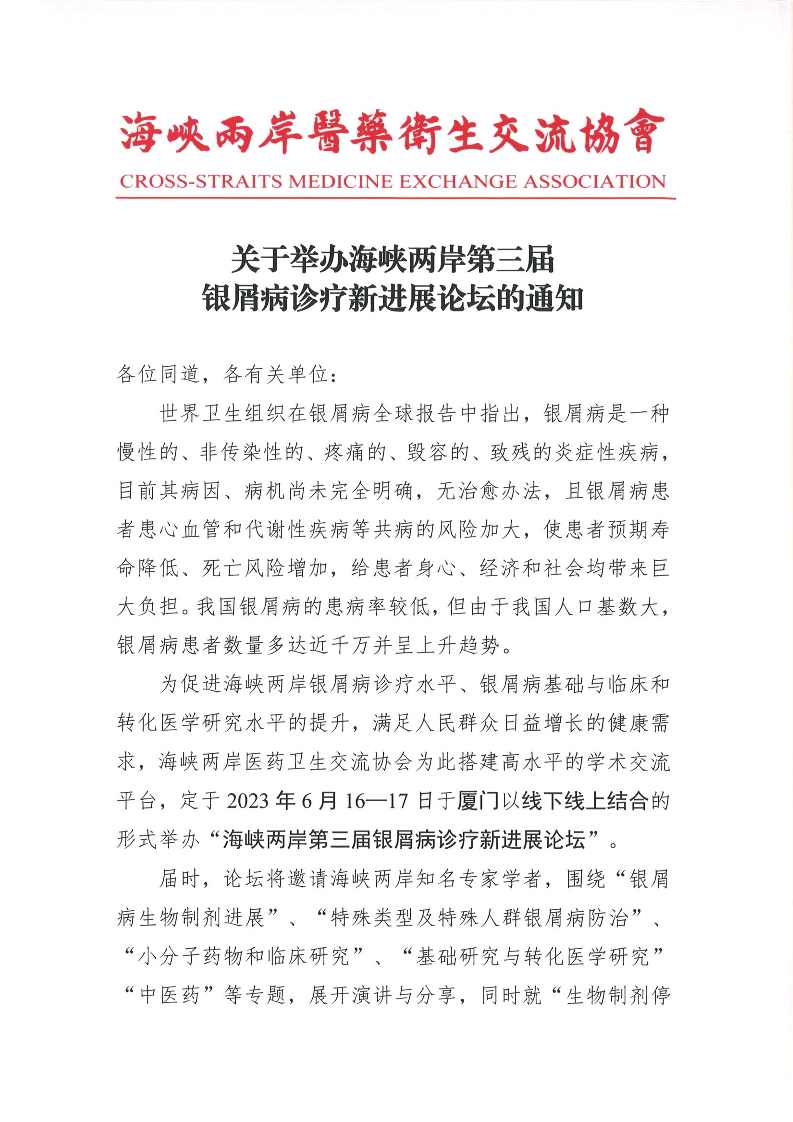 关于举办海峡两岸第三届银屑病诊疗新进展论坛的通知